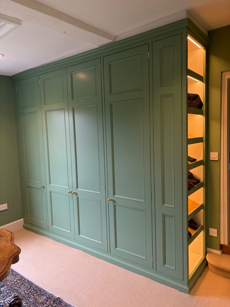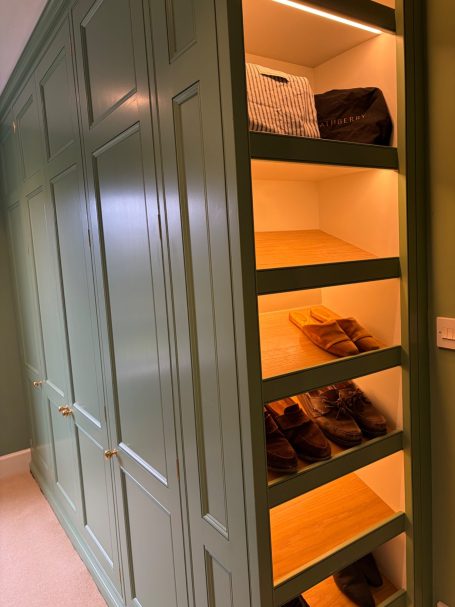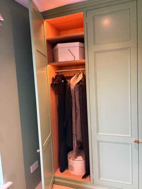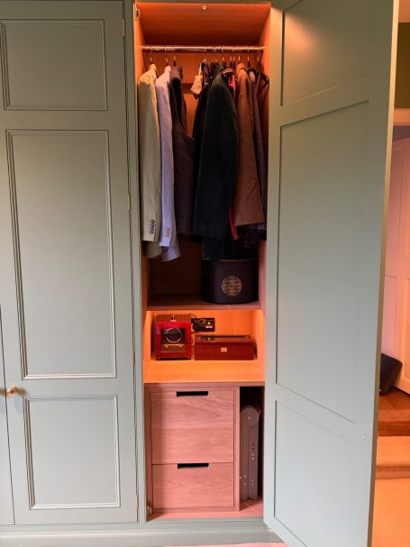 These bespoke wardrobes blend seamlessly into the room and are combined with antique pieces of furniture. The design was all about the details and making the most of the space available. From the door panel mouldings and flush beading to the frame to the internal drawers sized to suit Dyson hair dryers / straighteners with sockets to the back of the drawer, space and electrical supply for a watch winder.