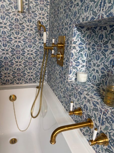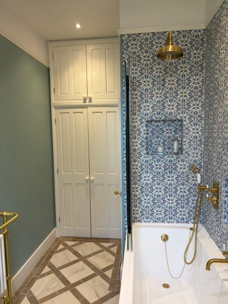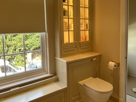 This luxury master ensuite bathroom beautifully blends classical charm with elegant natural materials. Our wonderful client recently moved and truly cherished their previous setup, so we decided to carry over those beloved elements into the new bathroom design. We’ve included lovely illuminated cabinets that cast a soft glow at night, perfect for those late-night visits! Plus, there’s a cleverly concealed radiator tucked under the seat to keep you warm on those chilly mornings! With its stunningly unique marble and handcrafted joinery, this space really embraces you in a warm welcome.